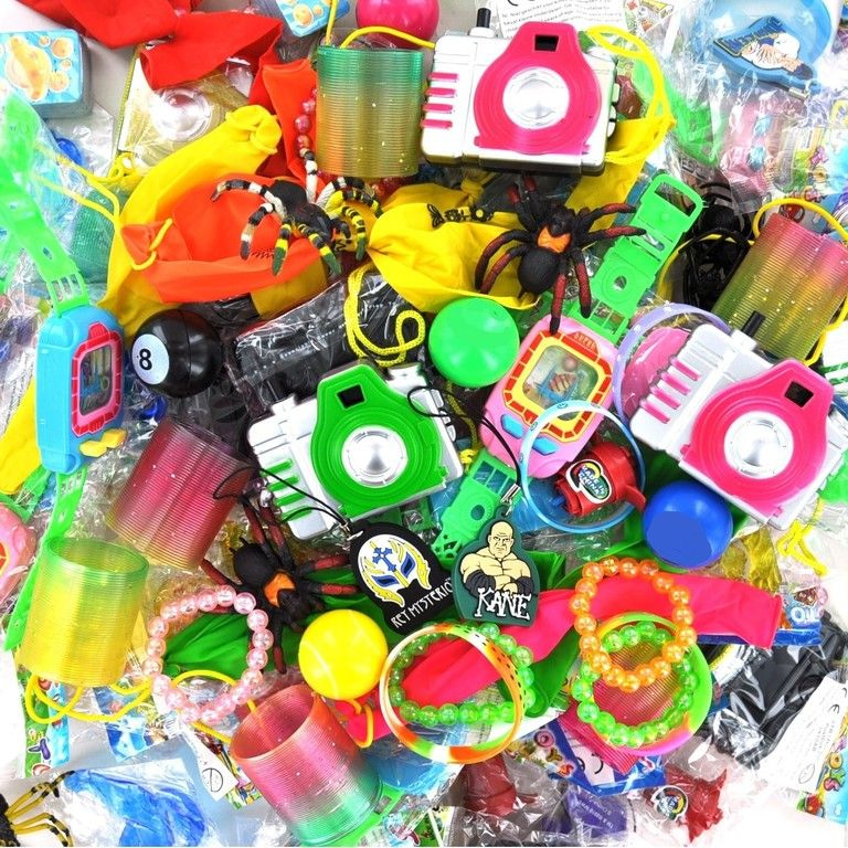 Big bag filled with various fun toys. Small toys items perfect for the grab bag. The mix bag includes stair runners, bracelets, slides cameras, balloons bounce, mini playing cards, tops, (key) pendants, balls, water games, sticky animals and spiders. A broad mix of fun for many bulletin.