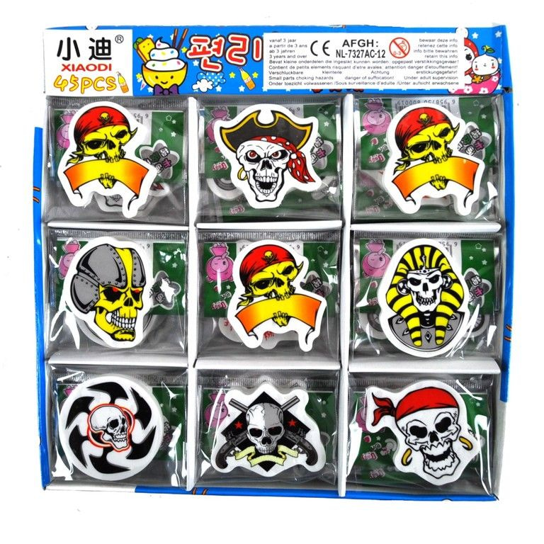 Tough erasers with various skull prints on it. Thanks so nice in the case of boys.