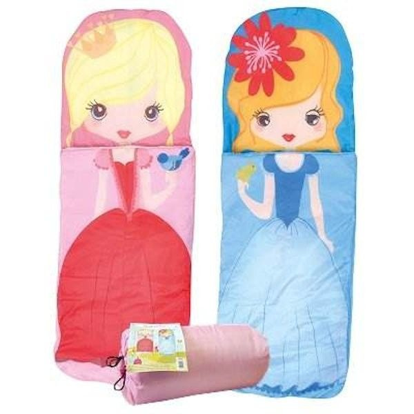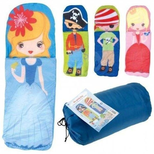 Sleeping bag for children in handy storage bag. Cute boys and girls children's sleeping bags, zipped and pirate or princess print.