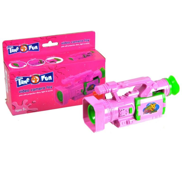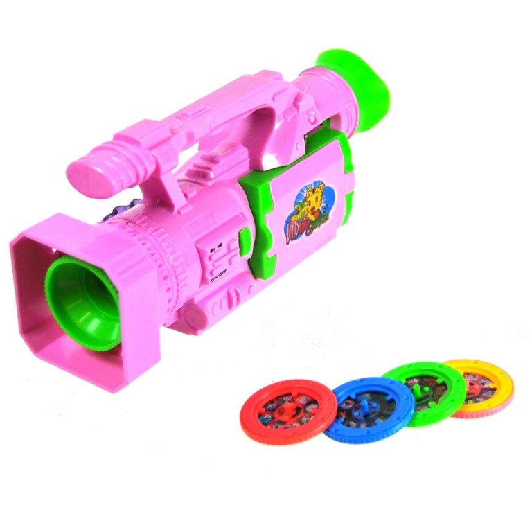 A pretty pink dia video camera for girls. Turn the wheel and you see a different images pass by.