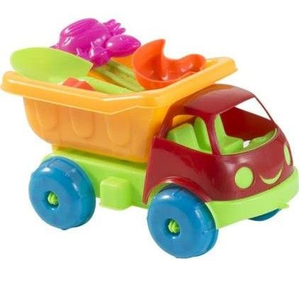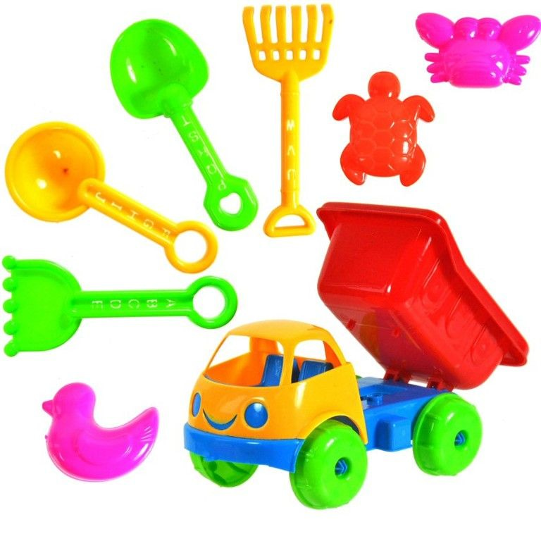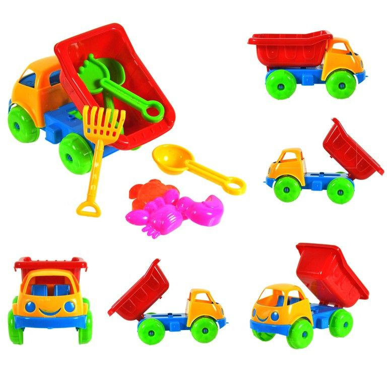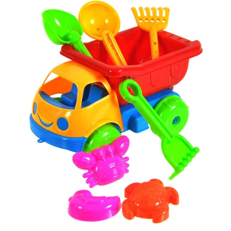 A colorful beach set with many different parts. The set consists of a dump truck, which can really tilting, several shovels, rakes and molds.