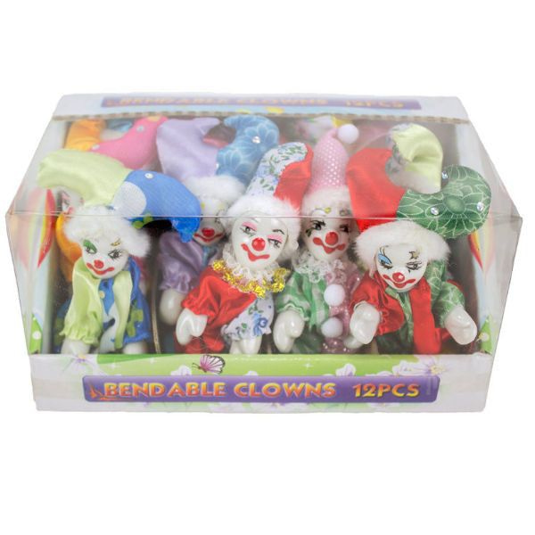 Porceleine Clowns in display box, are delivered with assortment of color clothing.