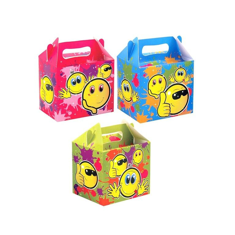 Menu box with the theme: Smileys. Dimensions 14 x 9.5 x 18 cm. Delivered in assorted colors.