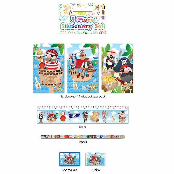 5-Piece Pirate writing set, consisting of: 1x Notebook, 1x Ruler, 1x Pencil, 1x Eraser and 1x Sharpener.