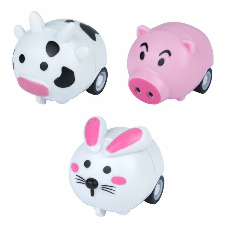 Very nice these cheerful pull back farm animals. Pull them to the rear and let them alone ... then he will drive forward. Comes in assortment types: Cow, Pig and Rabbit delivered in a display.