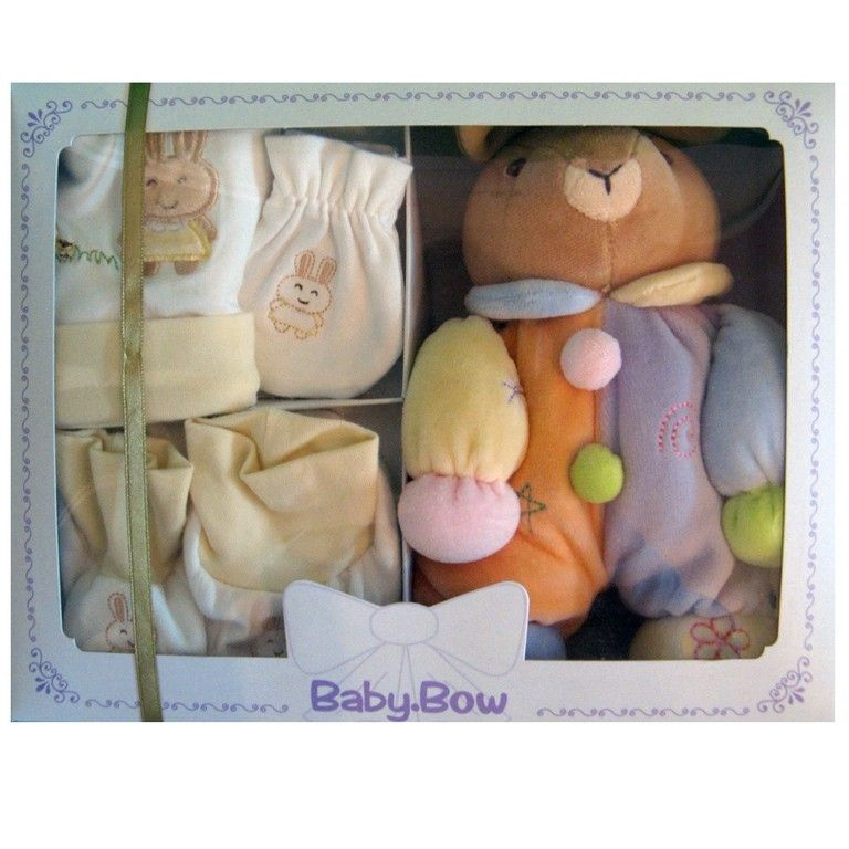 Superb gift package for a newborn baby. Packed in a beautiful box with see-through window. This set consists of: stuffed rabbit, socks, hat and (sock) shoes.