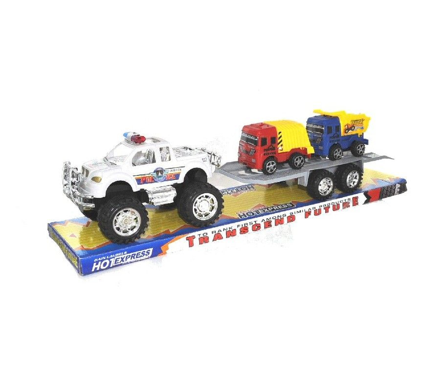 Trucks, cool cars, trucks, etc. it's a toy that never bored. This truck has a trailer with two cars on it.