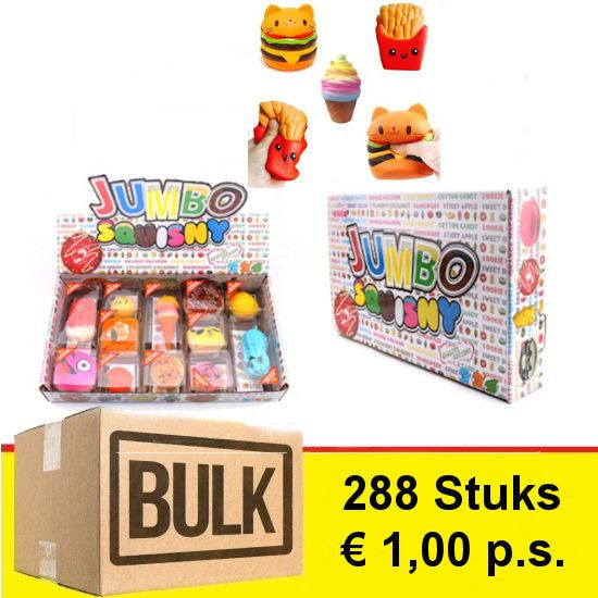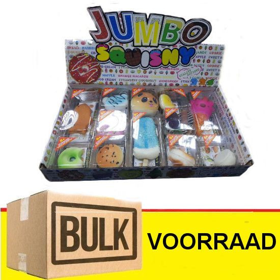 Jumbo Squisny packaged in a Display, with 12 different Jumbo Squisnies in 1 display.