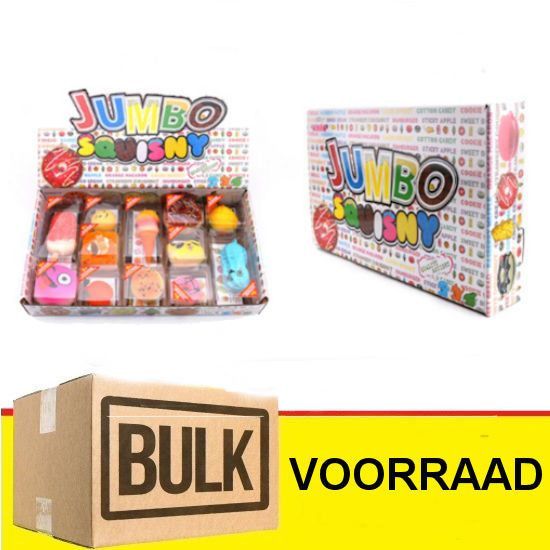 Jumbo Squisny packaged in a Display, with 12 different Jumbo Squisnies in 1 display.