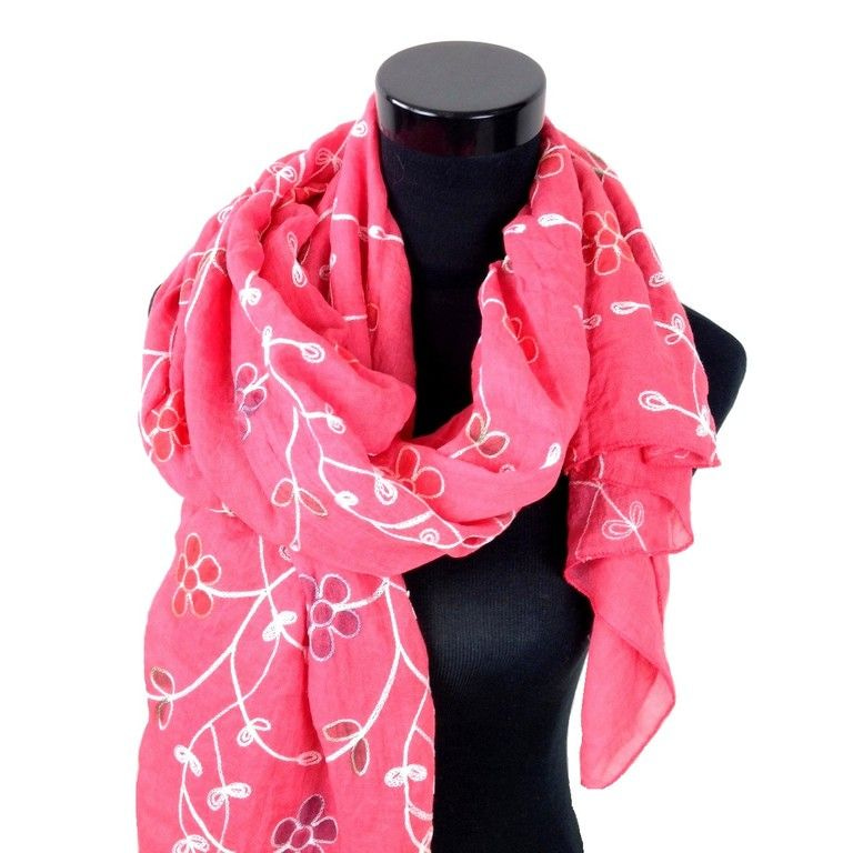 S_900004C - BEAUTIFUL CORAL RED SCARF WITH FLOWERS (1st)