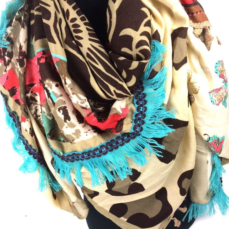 S_2449005 - SCARF WITH PRINT AND LIGHT TAUPE tassels (1st)