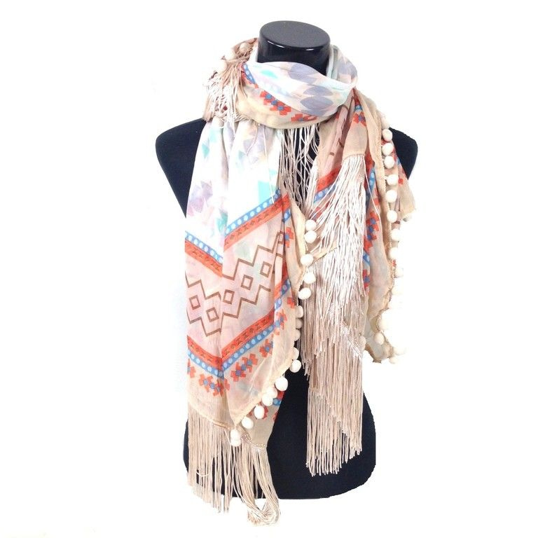S_2374005B - LUXURY SCARF WITH BULLETS AND AZTEK prints FRILLS CREAM (1st)