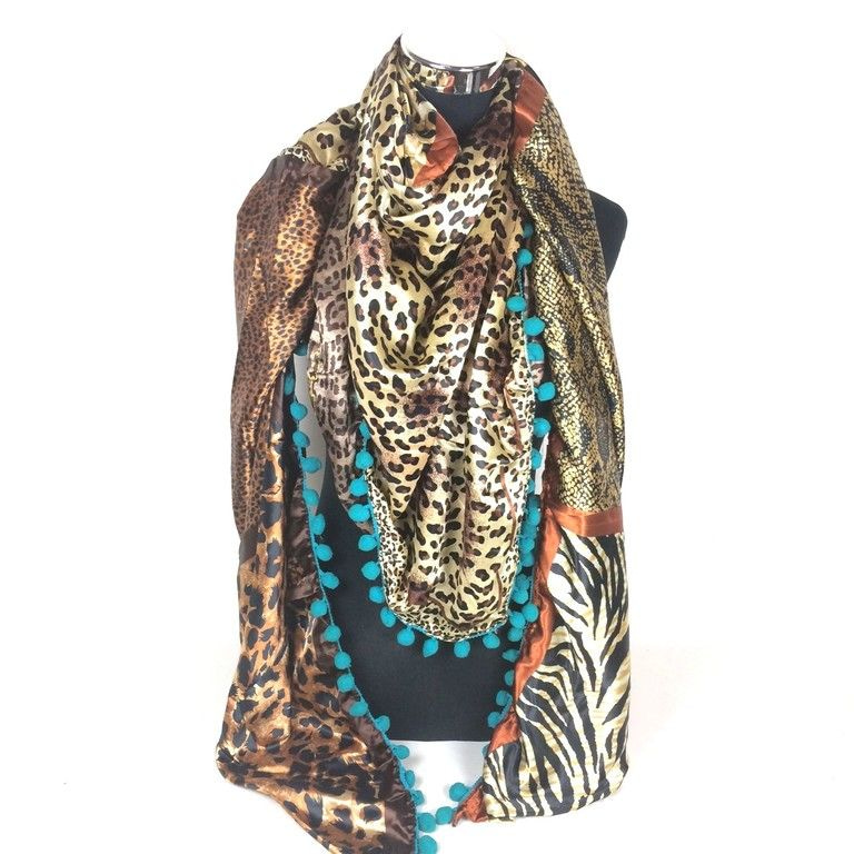 S_2149007BE - LUXURY 2-SIDED TRIANGLE SCARF BROWN / COLORFUL TURQUOISE BULLETS (1st)