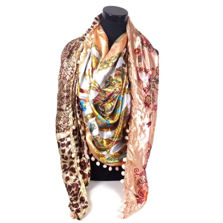 S_2149007BG - LUXURY 2-SIDED TRIANGLE SCARF BROWN / ORANGE TURQUOISE BULLETS (1st)