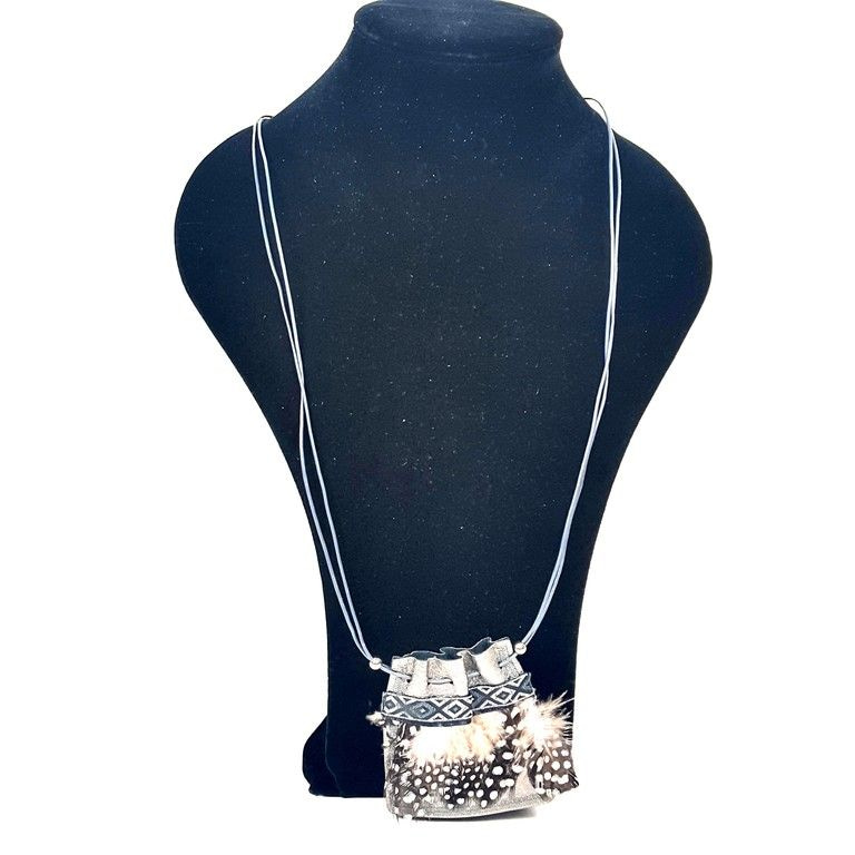 S_619117D - NECKLACE WITH LEATHER POUCH GRAY AND FEATHERS (1st)