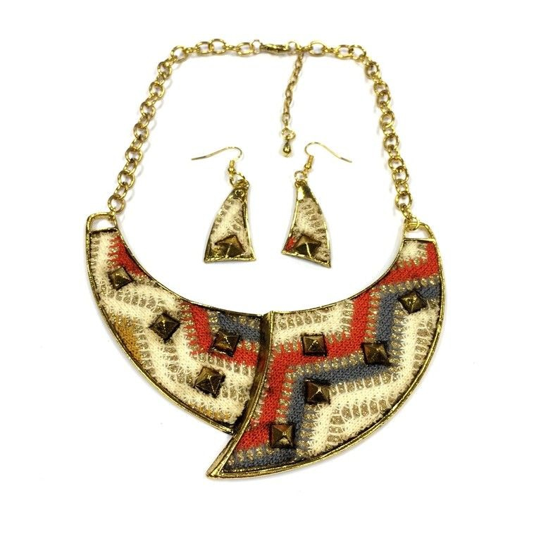 S_600566A - NECKLACE AND EARRINGS WITH STUDS CREAM / ORANGE / GREY (1st)
