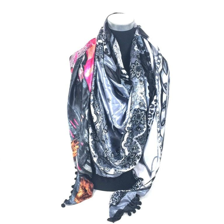 S_2149007GO - DELUXE 2-SIDED TRIANGLE SCARF GREY FLOWER / ZEBRA (1st)