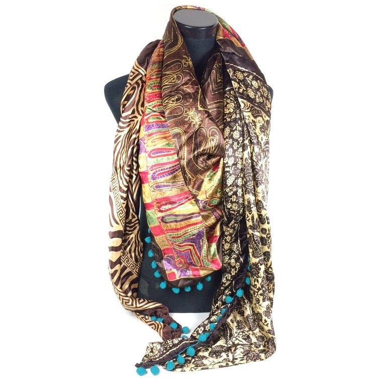 S_2149007AT - LUXURY SILK SCARF 2-SIDED TRIANGLE FRILLS BROWN (1st)