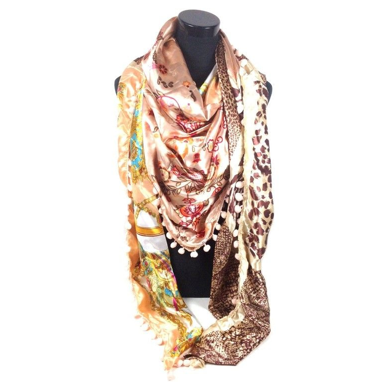 S_2149007AT - LUXURY SILK SCARF 2-SIDED TRIANGLE FRILLS BROWN (1st)
