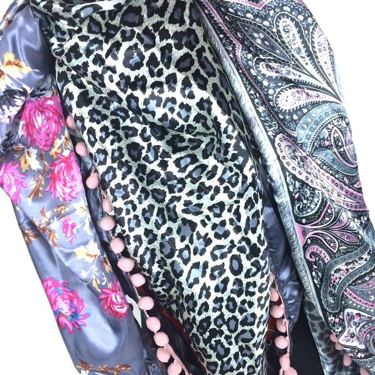 S_2149007GQ - DELUXE 2-SIDED TRIANGLE SCARF PANTHER / FLOWERS PINK / GREY (1st)