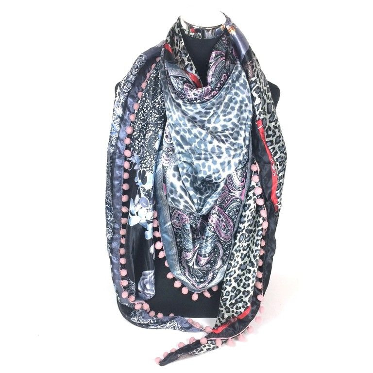 S_2149007FH - DELUXE 2-SIDED TRIANGLE SCARF PINK PANTHER FRILLS / GREY (1st)
