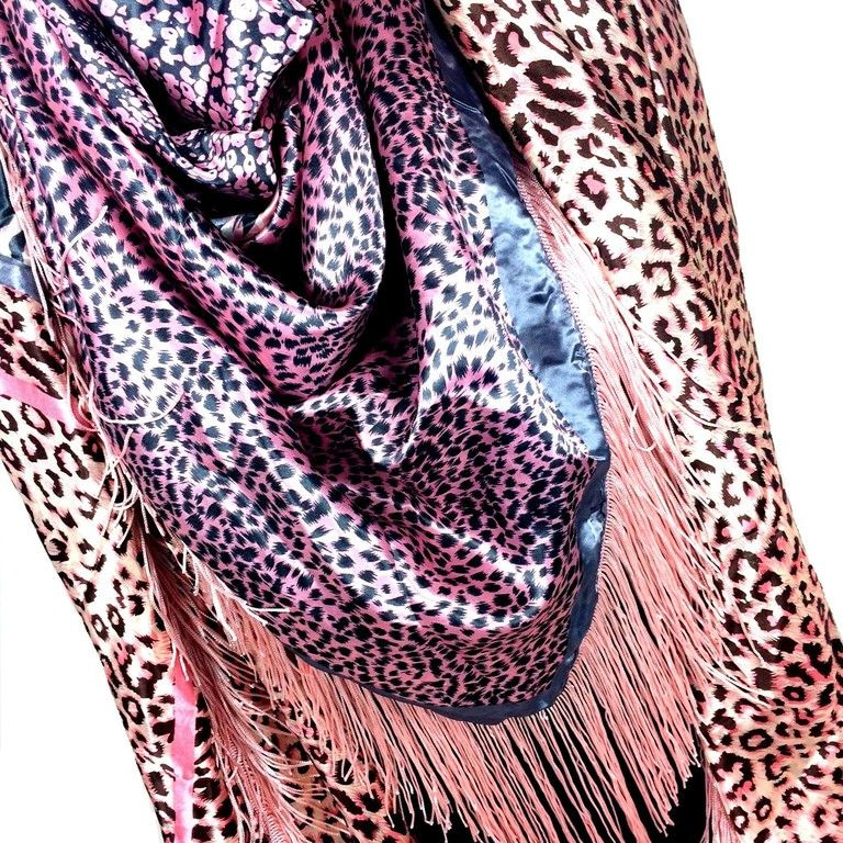 S_2149007IX - LUXE SCARF TRIANGLE 2-SIDED PINK FLOWER / PANTHER - BULLETS (1st)