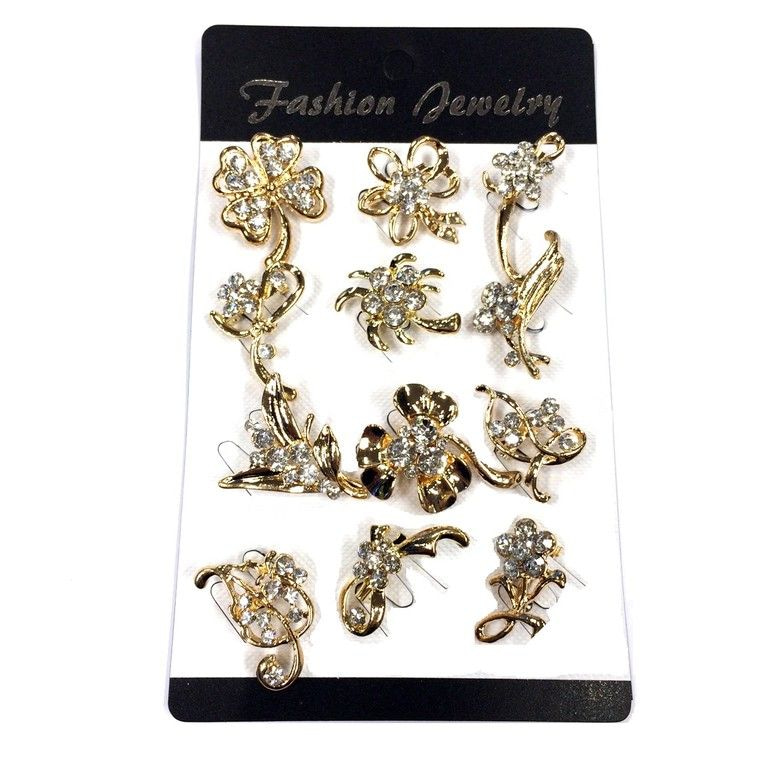 S_75329 - BROOCH GOLD WITH STRASS TRANSPARENT FLOWERS (12pcs)