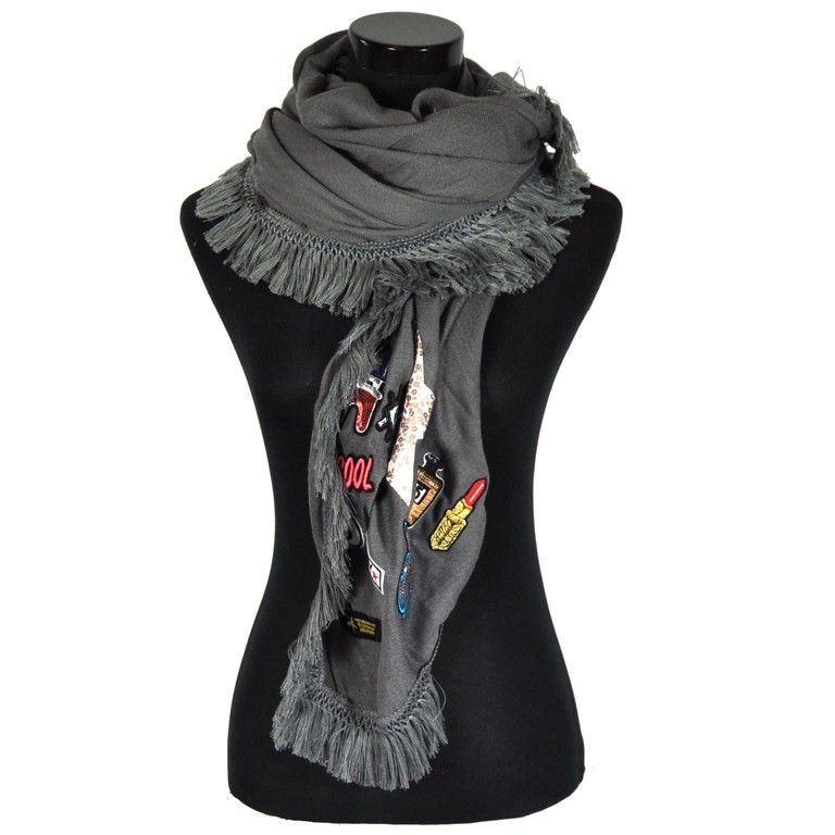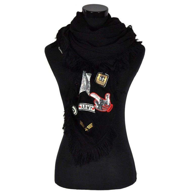 S_790871B - BLACK SQUARE SCARF WITH PATCHES AND FRILLS (1st).