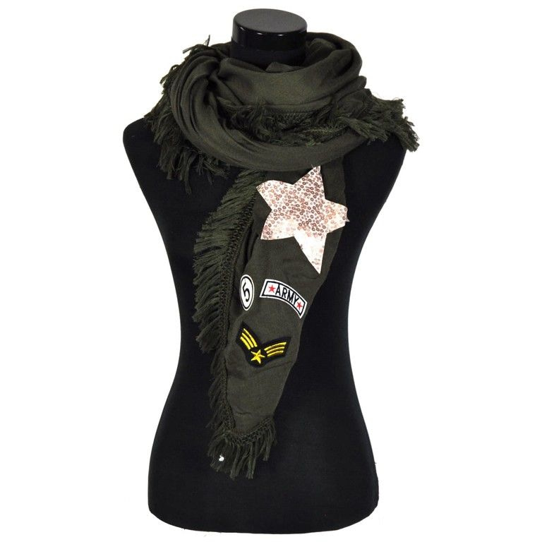S_790872C - DARK GREEN SQUARE SCARF WITH PATCHES AND FRILLS (1st).