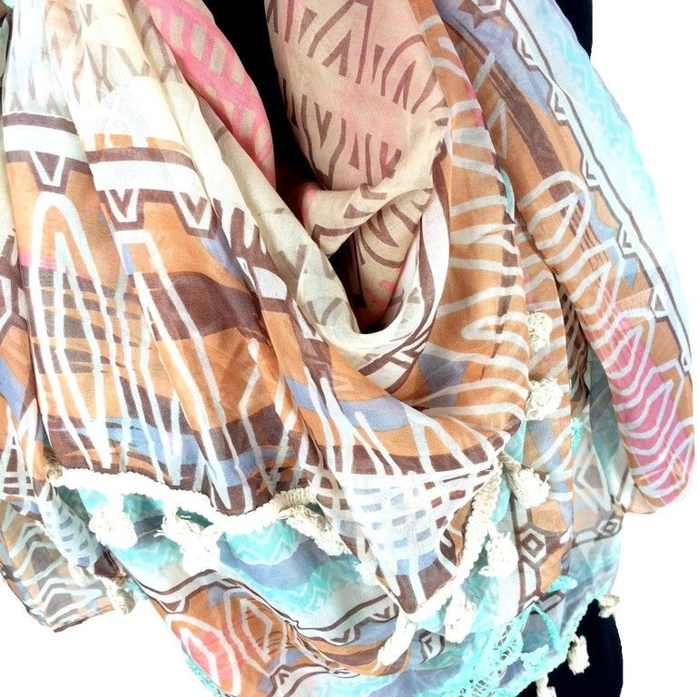 S_900008A - SCARF with tassels CREAM / ORANGE AND FUCHSIA (1st)