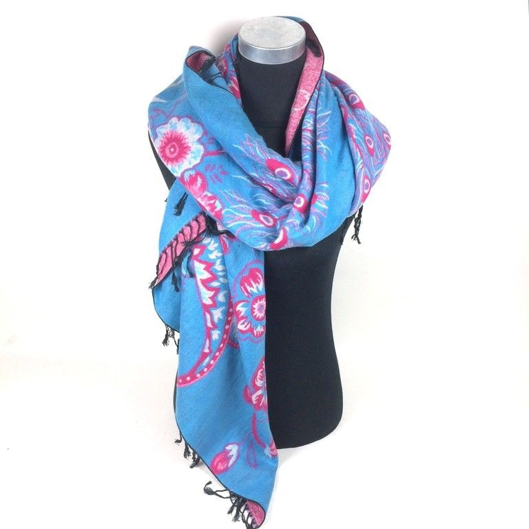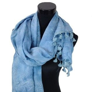 S_900017B - SCARF WITH WOVEN flowers and tassels BLUE (1st)